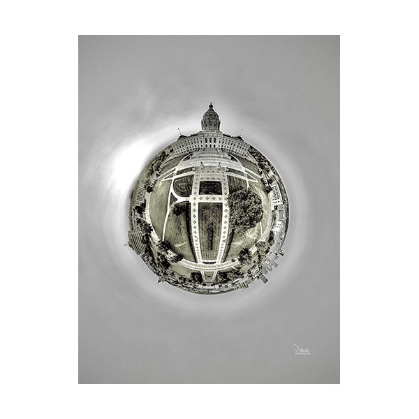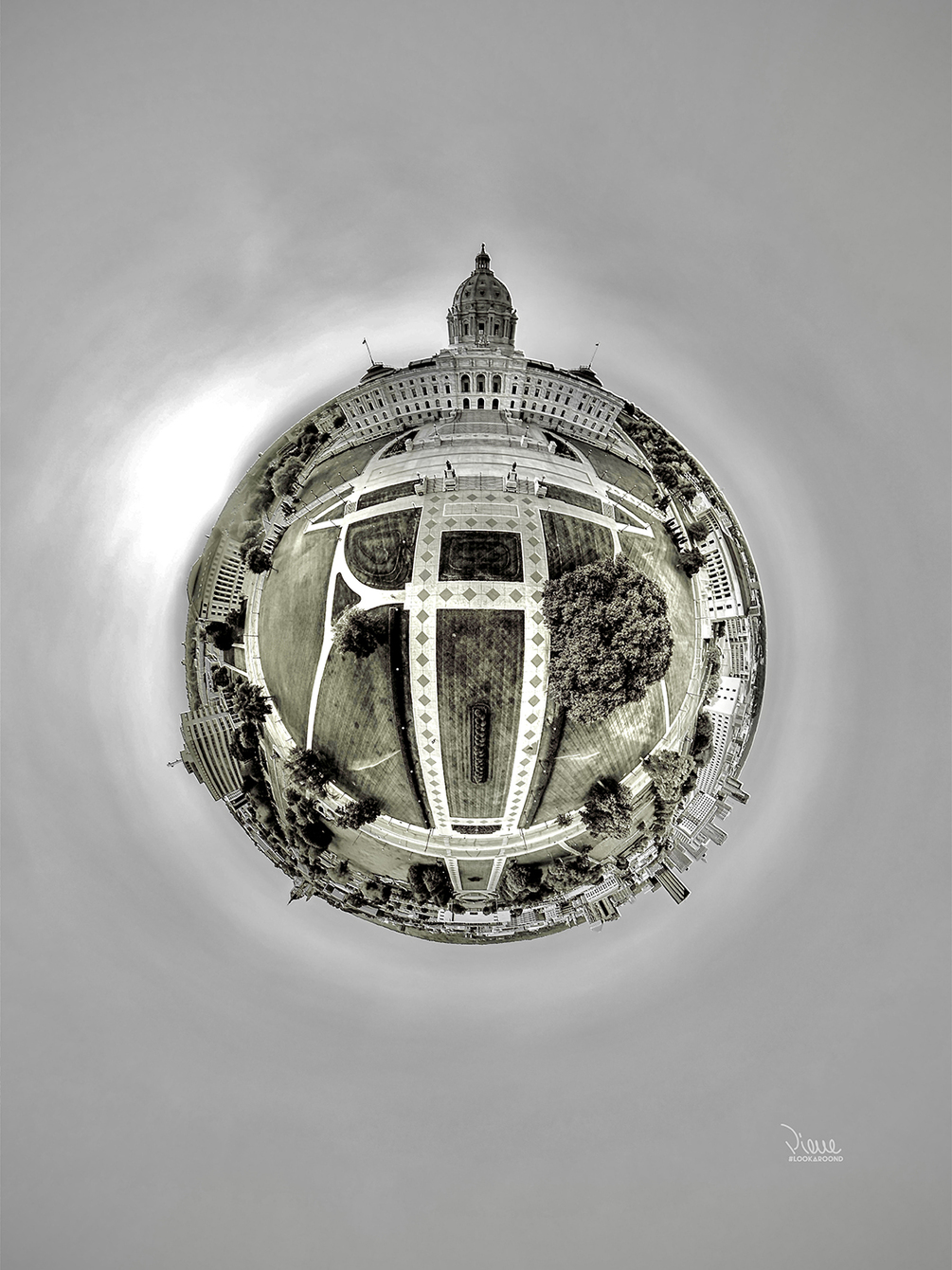 Description: A 360° tiny planet of the world surrounding the St. Paul Capitol with a downtown skyline and the Cathedral.