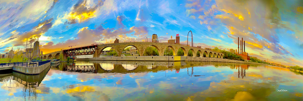 Description: Fine art panorama canvas of the Stone Arch Bridge featuring the most dramatic Minneapolis sunset over soothing waters.
